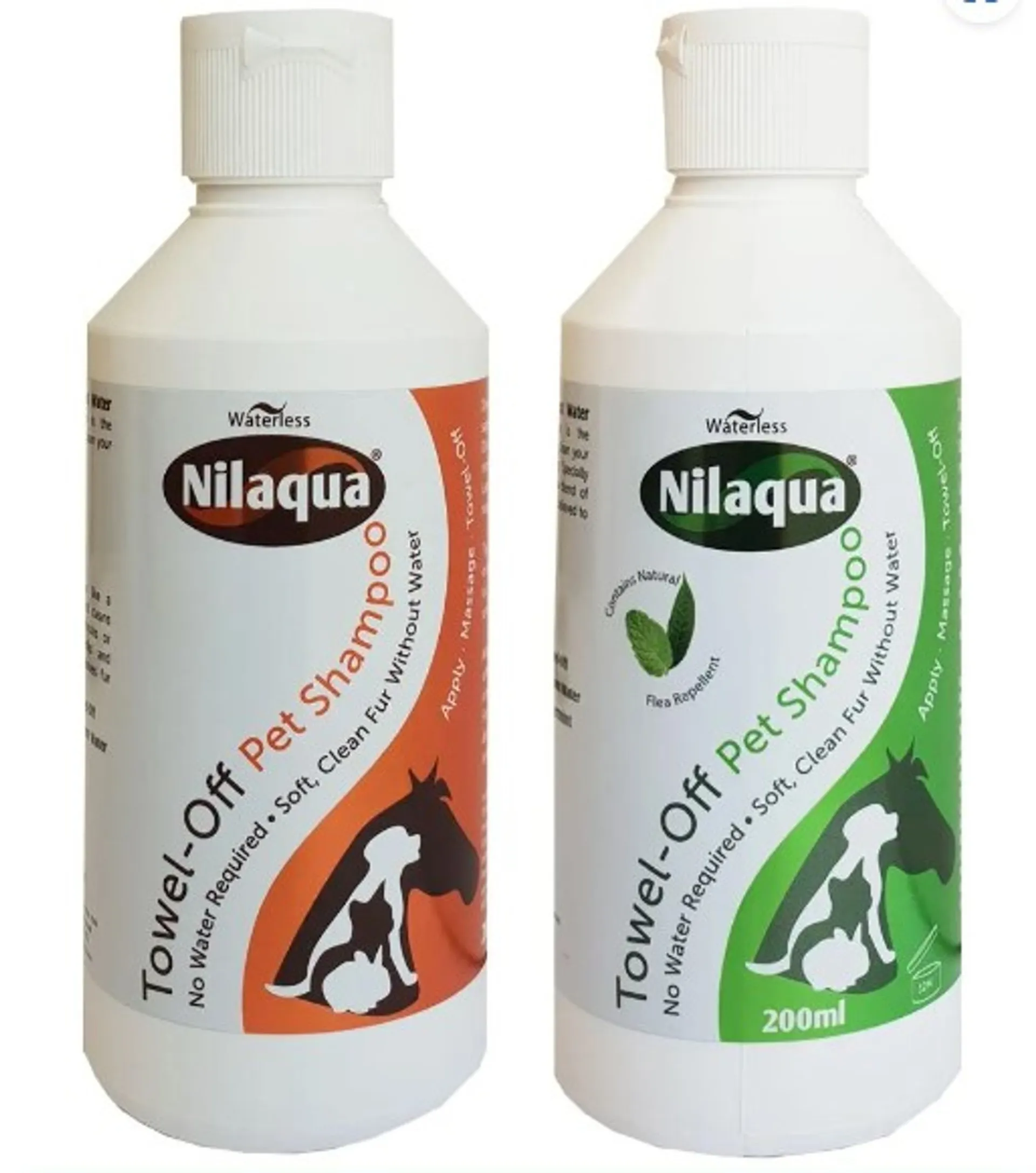 The Nilaqua twin pack washes your pets effectively without water, and repels fleas, ticks and flies.Nilaqua's Towel Off Pet Shampoo with Peppermint & Tea tree and Mulberry not only washes effectively without water, it repels fleas, ticks and flies. Simply apply the liquid directly to the area, massage to lift dirt and grease then remove by thoroughly towel drying. It's so simple and removes the toughest dirt and grease (even fox mess!).