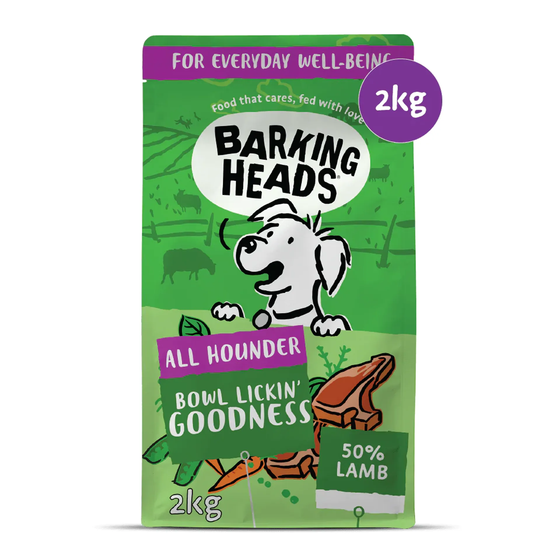 This recipe contains 50% grass-fed lamb, blended with at least 5 healthy and nutritious fruits and vegetables, including sweet potato, peas, and carrots. Barking Heads' recipe is crafted with human-grade quality ingredients from trusted farmers and contains no nasties or fillers. The natural dry dog food features a special blend of vitamins and minerals that support everyday vitality, including Selenium and Vitamin E to help support immune defense. The recipe is rich in slow-release carbohydrates to provide fuel for adventures, while pre-biotics support digestion and nutrient absorption. This food is approved by expert vets and specialist pet retailers and is made in the UK in a carbon-negative, fresh ingredients kitchen.
